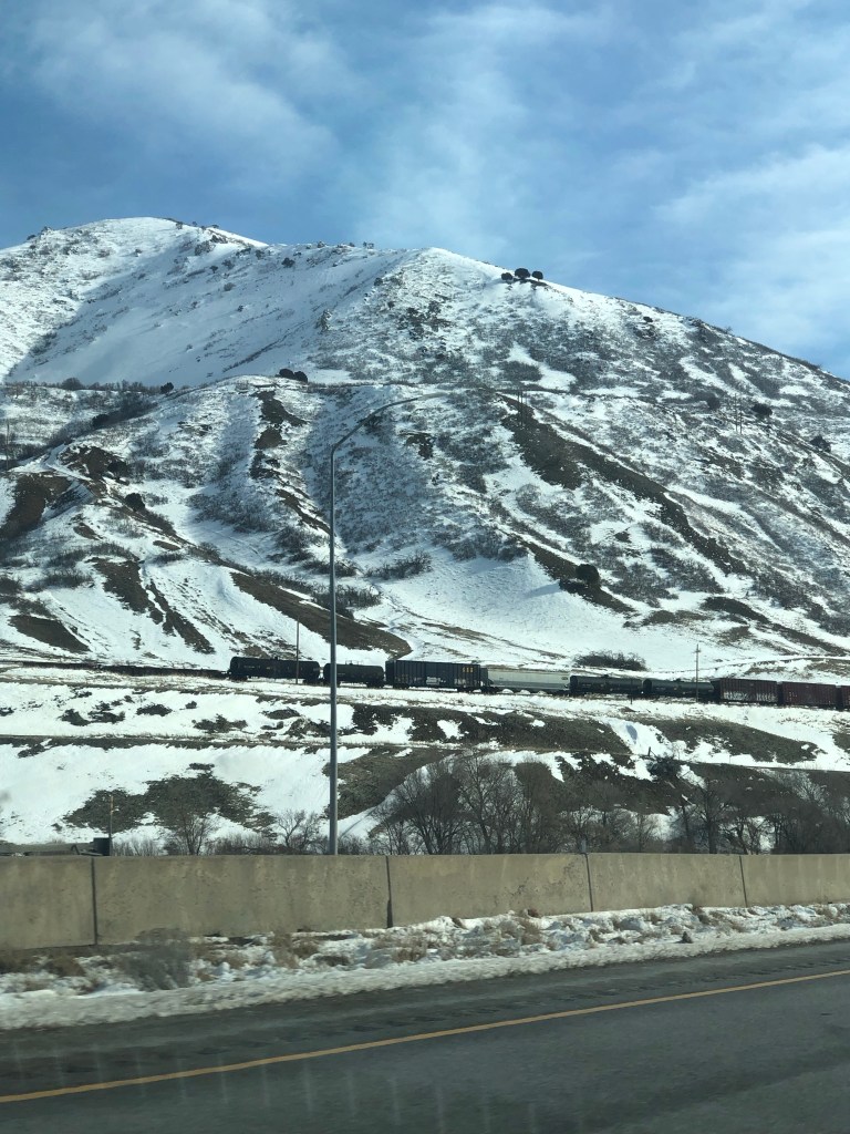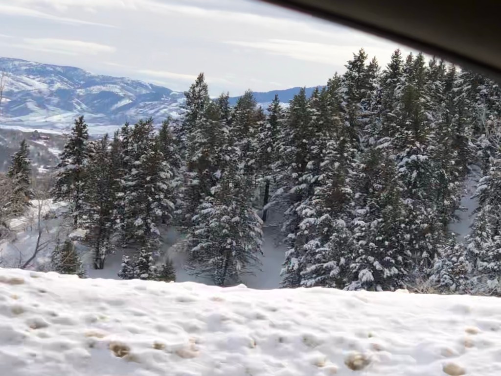 You know those little black lap dogs that are always wearing a red bow in those movies? Yes, at the neighbors out back. So hallmarkish…snow capped mountains and a cute city in the valley. Town square … yep, saw it too.…