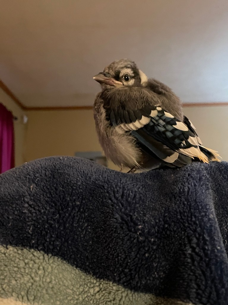 A baby blue jay that fell out of his nest. I’ve been taking care of him and finally got a chance to do some research on the spiritual aspect of why he’s here and what I’ve found truly is amazingly accurate. Also did some research on the character of these birds.